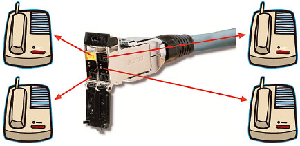 | Рисунок 5. Типичный способ использования принципа Cable Sharing в операторских центрах и помещениях с факсимильными аппаратами. |