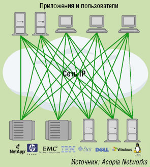 | Рисунок 2. Виртуализация сетевых устройств хранения вводит абстрактный уровень виртуализации между клиентами и ресурсами архивирования. |