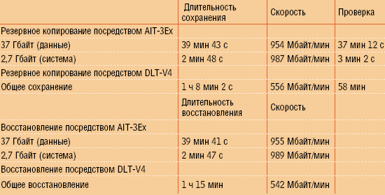 Для сравнения была измерена скорость передачи ленточного накопителя DLT-V4 от Tandberg. При этом сохранялись все данные (37 Гбайт плюс 2,7 Гбайт), а их обюем совпадал с суммарным обюемом для двух предыдущих задач. При этом ленточный накопитель Tаndberg показал скорость 556 Мбайт/мин, а длительность резервного копирования составила 1 ч 8 мин и 2 с.