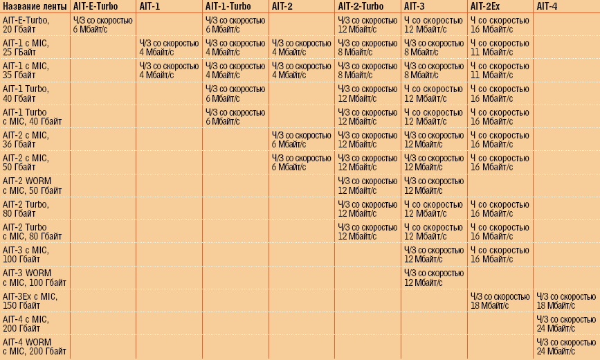 Таблица 1. Совместимость носителей AIT (Ч = чтение, З = запись).