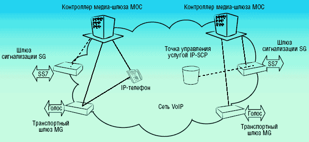 - точка управления сервисом (IP-enabled Service Control Point, SCP), целиком находящаяся в сети IP, но адресуемая из сети ОКС-7;