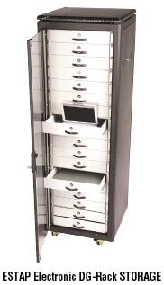 Напольные конструктивы DG-Rack STORAGE формата 19″ производства ESTAP Electronic выполнены на базе универсальных шкафов серии DG-Rack. Эта серия предназначена для построения типового телекоммуникационного узла или установки серверного оборудования. Все шкафы имеют в своем составе самонесущую раму с четырьмя направляющими 19″, пол, крышу, переднюю стеклянную дверь в стальной раме или цельнометаллическую (по выбору заказчика), замок с поворотной ручкой. Дверь может быть установлена для открывания в левую или правую сторону. Задняя дверь — цельнометаллическая, снабжена замком. Боковые стенки съемные, на них имеются замки и защелки. Кроме того, шкафы серии DG-Rack комплектуются набором роликов.