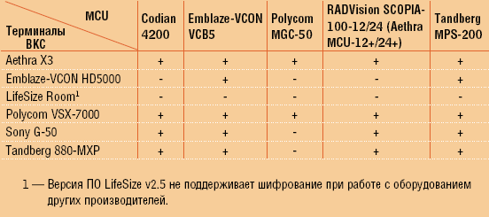 Не всегда у организации и ее партнеров, использующих видеоконференц-связь, применяется оборудование одного производителя. В подобной ситуации обеспечение совместимости MCU и имеющегося терминального оборудования может стать настоящей головной болью. Приведенные в Таблицах 4 и 5 данные позволяют оценить совместимость MCU при работе с терминалами ВКС различных производителей в отношении поддержки шифрования и стандарта H.239. Последний обеспечивает демонстрацию на дополнительном экране системы видеоконференц-связи вспомогательного медиапотока, например презентации PowerPoint.