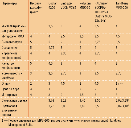 Как видно, итоговая оценка с учетом весовых коэффициентов не внесла изменений в тройку лидеров. Отрыв MCU Codian 4200 становится чуть больше, разрыв между RADVision SCOPIA-100-12/24 (Aethra MCU-12+/24+) и Polycom MGC-50 сокращается ненамного.