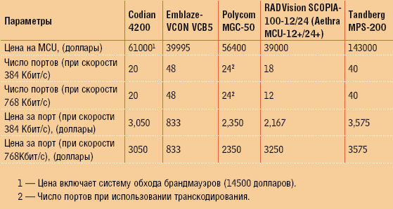 Как видим, цена за порт минимальна у двух моделей: программного Emblaze-VCON и аппаратного RADVision/Aethra (на скорости 384 Кбит/с). Если ориентироваться на уровень стоимости, именно эти устройства наиболее интересны для российского сектора SMB.