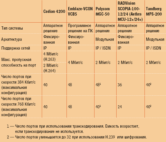 Напомним также, что минимально допустимой пропускной способностью для передачи видеотрафика является скорость 384 Кбит/с, а оптимальной — 768 Кбит/с. Передача и кодирование видео с различными скоростями требует от MCU различных программных ресурсов, их выделение часто приводит к уменьшению числа портов, а, следовательно, и максимального числа участников конференции.
