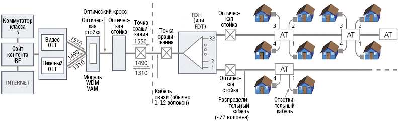 Мультиплексор со спектральным уплотнением (Wavelength Division Multiplexer, WDM) направляет в волокно данные, голосовые и видеосигналы, являясь, таким образом, ключевым элементом инфраструктуры FTTH. Кроме того, для распределения сигналов между конечными клиентами используются оптические разветвители (сплиттеры). Размещение этих компонентов на коммутационном узле или линейных сооружениях — централизованно или каскадно — имеет важное стратегическое значение и во многом определяет не только гибкость сети, но и затраты на нее.
