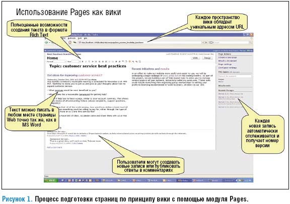 Инструмент Pages призван ввести в повседневное обращение приложения Web. С его помощью можно создавать персонализированные страницы — как для отдельных сотрудников, так и для небольших групп пользователей (см. пример на Рисунках 1 и 2). Это достигается при помощи ряда элементов, которые, к примеру, связывают внутрикорпоративные информационные ресурсы с изобразительными и интерактивными элементами. Как утверждает BEA, сложные процессы программирования и настройки становятся не нужны, поскольку все операции выполняются при участии программных мастеров или по методу «буксировки» (Drag and Drop). Это упрощает выполнение рутинных процедур, экономит время и дает сотрудникам возможность реализовать свою изобретательность и конструкторский талант. Например, те, кто работает вне офиса, могут дополнить свои адресные базы данных картами службы Google Maps.