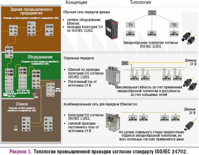 В отличие от более высоких уровней промышленной кабельной инфраструктуры на конкретную топологию проводки в области автоматизации очень сильно влияет конструкция отдельного станка или концепция конкретного производственного модуля (см. Рисунок 3). Наряду с иными конструкциями разъемных соединителей используется построение сети в форме гибридной звезды, с помощью которой конечная точка одновременно подключается по Ethernet и получает питание от источника постоянного тока напряжением 24 В. Некоторые производители, например те, что выпускают оборудование для изготовления различных пластмассовых изделий, предлагают собственные концепции, идеология которых оптимальным образом согласована