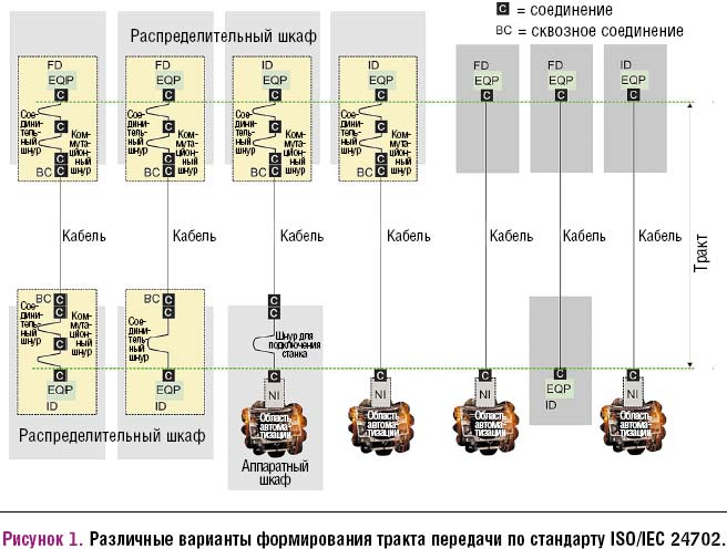 В случае промышленной проводки простейший — и наиболее излюбленный — тракт передачи соединяет два устройства и образован кабелем, на обоих концах которого находятся вилки разъемных соединителей. Согласно ISO/IEC 11801 разъем на устойстве не включается в состав тракта передачи информационного сигнала, в результате чего в промышленном стандарте появилось любопытное определение «бесконнекторный». Кроме того, стандартом нормируется большое количество более сложных структур, точки соединения которых находятся в коммутационных шкафах или расположены перед транспортерами (см. Рисунок 1). Наличие подобных трактов позволяет решать основные задачи автоматизации промышленного производства и без излишних сложностей прокладывать проводку для Ethernet в разных условиях окружающей среды. Важным является то, что ни один из профилей автоматизации не требует применения дополнительных структур промышленных трактов кроме тех, которые описаны в стандарте.