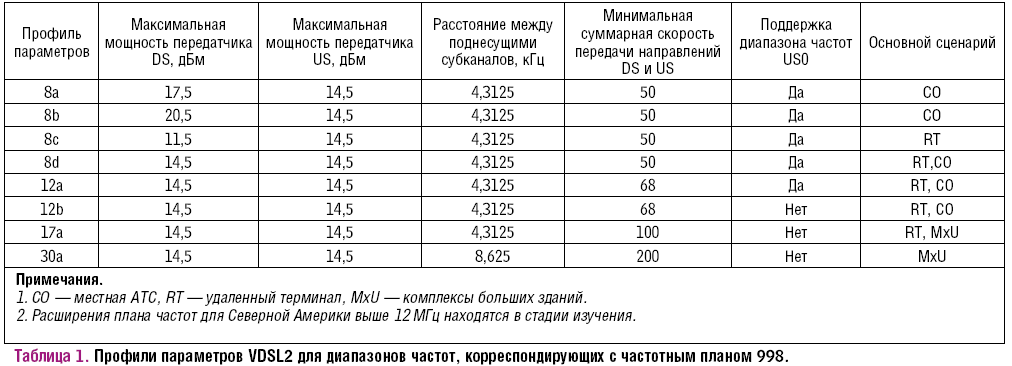 Профили параметров и реально достижимые длины линий VDSL2. Профили параметров модемов VDSL2 различаются максимальной мощностью передатчиков, максимальной рабочей полосой частот, использованием диапазона US0 на длинных линях и положением узла доступа (Таблица 1).