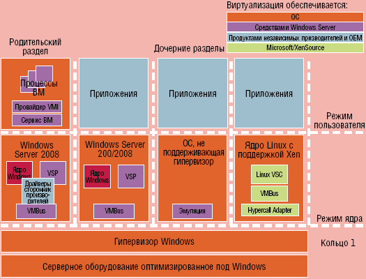 Рисунок 3. Виртуализация Windows Server 2008 поддерживает 64-разрядные серверы и гостевые ОС, SMP для гостевых систем, динамическое добавление виртуальных ресурсов и перенос ОС/приложений, предлагает новые пользовательский интерфейс и интеграцию с SCVMM.