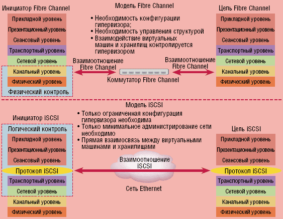 Различие между Fibre Channel и iSCSI в виртуализированных средах заключается в способе организации соединения между виртуальными машинами и системами хранилищ. Ни один из двух способов взаимодействия не следует полностью модели OSI, и тем не менее, Fibre Channel можно соотнести скорее с низшим уровнем (уровнем передачи или сохранения), а iSCSI - с одним из высших, логических (см. Рисунок 1).