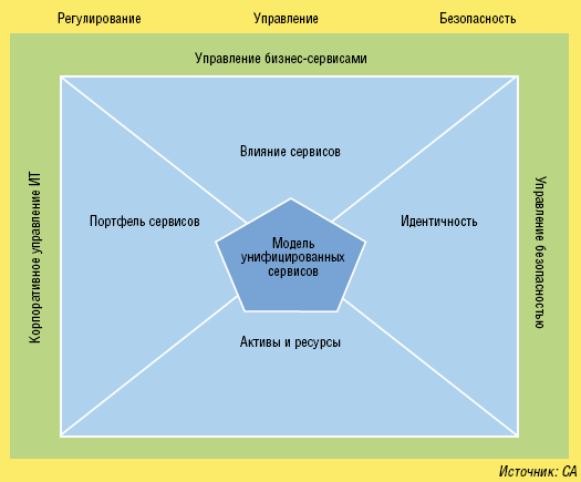 Такая универсальная сервисная модель (Unified Service Model), которой компания CA следует в рамках стратегии управления корпоративной средой ИТ (Enterprise IT Management, EITM), объединяет сервис с точки зрения пользователя со всеми поддерживающими технологиями и сохраняет целостность определения сервиса на протяжении всего срока его жизни (см. Рисунок 2). Этот подход позволяет автоматически отображать зависимость между производительностью ИТ и компонентами инфраструктуры и создает условия для быстрой идентификации и решения сервисных проблем, а также расстановки приоритета административных меро-
