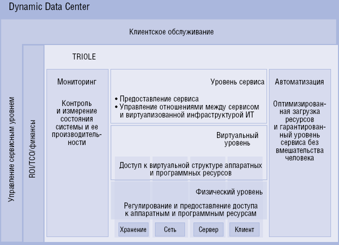 Таким образом, внедрение SOA требует разработки цельной концепции для ЦОД, важнейшими элементами которой являются виртуализация и автоматизация (см. Рисунок 1). Отделение приложений от аппаратного обеспечения и перевод множества приложений в центральный пул обеспечивают лучшую загрузку вычислительных ресурсов. Благодаря интеллектуальному управлению системными ресурсами, мейнфреймы образуют в серверном пуле таких инфраструктур наиболее экономичную основу для обработки больших объемов данных и поддержки многочисленных пользователей.