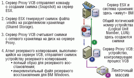 VCB активирует процесс резервного копирования из ВМ и вводит его в инфраструктуру. Это резервное копирование длится лишь несколько секунд, дополнительные затраты (Overhead) физических ресурсов минимальны. Кроме того, можно создавать полные, инкрементные или дифференцированные резервные копии ВМ Windows. В сочетании с сервером резервного копирования сервер Proxy VCB берет на себя задачи резервирования и устраняет накладные расходы при создании индивидуальных резервных копий ВМ.