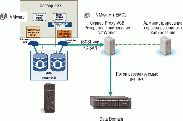 Рисунок 3. Резервное копирование среды VMware с Data Domain и программным обеспечением для резервного копирования с поддержкой VCB.