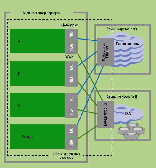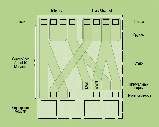 вместо коммутаторов Ethernet и Fibre Channel. HP представила решение Virtual Connect в середине 2006 г., оно позволяет один раз подсоединить кабели к модульному шасси HP BladeSystem c-Class (полке в терминологии HP) и назначить параметры внешних подключений модульных серверов к локальным сетям и системам хранения в интерфейсе Virtual Connect Manager. MAC-адреса и WWN хранятся в микропрограмме коммутационных модулей и ассоциируются с «серверным профилем», а не с серверами, поэтому изменения на уровне шасси (например, перестановка сервера в другой слот) не влияют на внешние адреса.