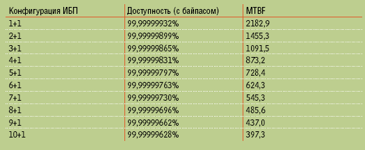 Планируя избыточность, следует помнить об усилении подверженности сбоям вследствие увеличения количества элементов. Достижение доступности всегда требует данных о числе отдельных компонентов. Результаты расчета для конфигураций ИБП указаны в Таблице 2.