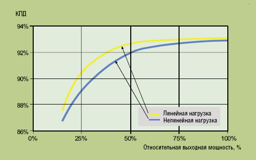 Рисунок 2. Зависимость КПД ИБП от линейной и нелинейной нагрузки.