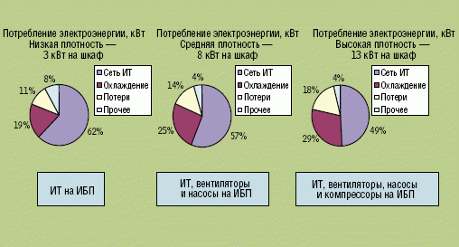 По мере усложнения системы растет потребление электроэнергии, предназначенной для охлаждения и компенсации потерь в инфраструктуре (см. Рисунок 1). Следует помнить, что при повышении удельной мощности увеличивается чувствительность к сбоям, поэтому защита с помощью ИБП становится необходимой.