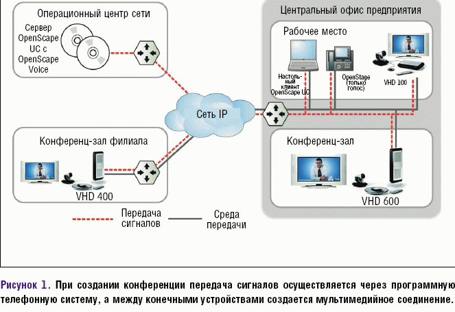 Рисунок 1. При создании конференции передача сигналов осуществляется через программную телефонную систему, а между конечными устройствами создается мультимедийное соединение.