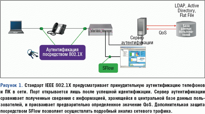 Рисунок 1. Стандарт IEEE 802.1X предусматривает принудительную аутентификацию телефонов и ПК в сети. Порт открывается лишь после успешной идентификации. Сервер аутентификации сравнивает полученные сведения с информацией, хранящейся в центральной базе данных пользователей, и присваивает предварительно определенное значение QoS. Дополнительная защита посредством SFlow позволяет осуществлять подробный анализ сетевого трафика.