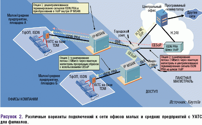 Рисунок 2. Различные варианты подключений к сети офисов малых и средних предприятий с УАТС для филиалов.