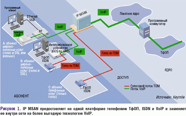 Рисунок 1. IP MSAN предоставляет на одной платформе телефонию ТфОП, ISDN и VoIP и заменяет ее внутри сети на более выгодную технологию VoIP.