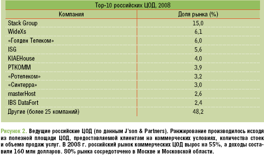 Рисунок 2. Ведущие российские ЦОД (по данным J’son & Partners). Ранжирование производилось исходя из полезной площади ЦОД, предоставляемой клиентам на коммерческих условиях, количества стоек и объема продаж услуг. В 2008 г. российский рынок коммерческих ЦОД вырос на 55%, а доходы составили 160 млн долларов. 80% рынка сосредоточено в Москве и Московской области.