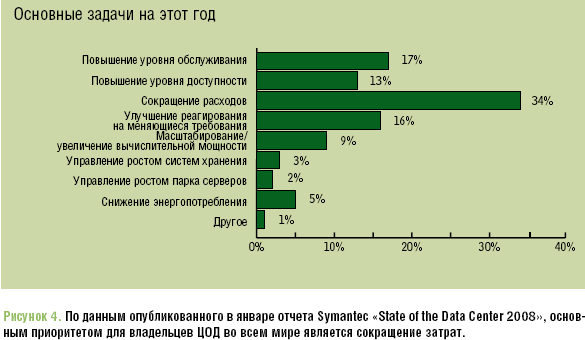Рисунок 4. По данным опубликованного в январе отчета Symantec «State of the Data Center 2008», основным приоритетом для владельцев ЦОД во всем мире является сокращение затрат.