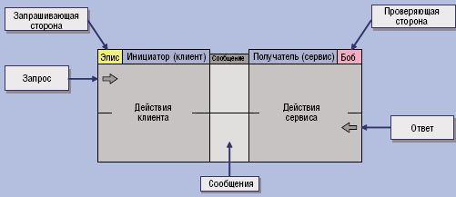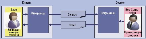 В основе дальнейшего рассмотрения хореографии лежит следующий сценарий: действующее лицо со стороны клиента состоит из пользователя «Элис» (запрашивающая сторона) и програм-много компонента «инициатор», осуществляющего по поручению Элис коммуникацию с сервисом. Сервисная сторона воплощена в виде программного компонента «получатель» и поставщика услуг Bob Corporation (проверяющая сторона). Обычно инициатор на стороне клиента отправляет сообщение с запросом, получатель производит определенные действия и отправляет ответное сообщение. Базовый сценарий иллюстрирует Рисунок 2.