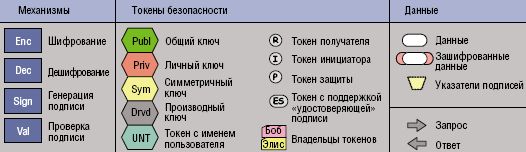 Хореографические шаблоны состоят из комбинации различных механизмов безопасности, которые, в свою очередь, основываются на базовых криптографических алгоритмах. Перед детальным рассмотрением нескольких типичных хореографий еще раз (путем изображения шаблонов) продемонстрируем лежащие в их основе алгоритмы. На Рисунке 4 приведено краткое описание использованных символов.