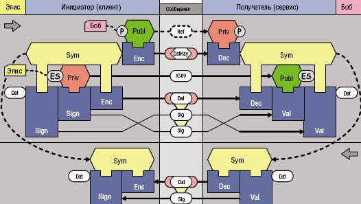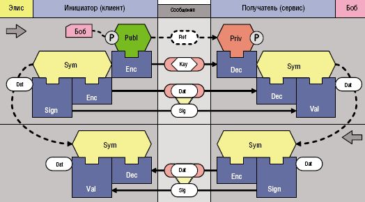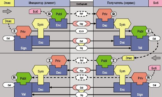 Если и клиент, и сервис обладают токенами безопасности, к примеру, в виде сертификатов X.509, включая соответствующий личный ключ, то в этом случае можно воспользоваться асимметричным соглашением. На Рисунке 7 показана хореография такого соглашения. Шифрование данных в сообщении-запросе осуществляется на стороне клиента с помощью сгенерированного симметричного ключа, который шифруется посредством общего ключа от Bob Corporation и затем предоставляется в распоряжение сервиса. Подпись выполняется с применением личного ключа Элис. Соответственно, на стороне сервиса для расшифровки данных потребуется личный ключ Bob Corporation, а для подтверждения подписи — общий ключ от Элис.