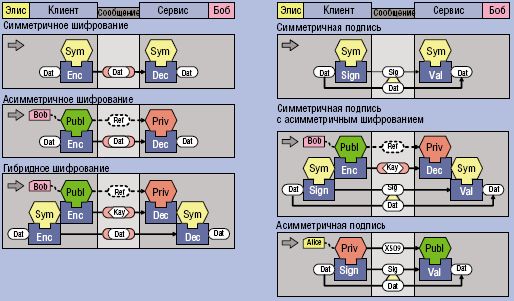 Действиям соответствуют комплементарные парные методы шифрования и дешифрования, а также генерирования и проверки подписей. Генерирование подписей и их проверка представляют собой сложные процессы. Схематичное изображение упрощено до такой степени, что в нем присутствуют только задействованные ключи и важнейшие данные, требующие подписи. Примеры схем шаблонов показаны на Рисунке 5.