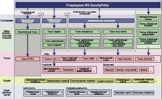 Модель утверждений WS-Security-Policy состоит из отдельных комбинируемых групп. К примеру, утверждения защиты (Protection Assertion) определяют, какие части сообщений необходимо защитить посредством шифрования или подписи. А обязательные утверждения безопасности (Security Binding Assertions) и поддержки токенов (Supporting Token Assertions) в значительной мере определяют хореографию безопасности между клиентом и сервисом. При этом можно задать следующие свойства: