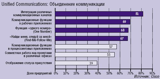 Нельзя утверждать, что такой потребности не существовало: согласно исследованию «Unified Communications Application: Uses and Benefits» (январь 2006 г.), проведенному аналитиками Sage Research, для того чтобы оставаться на связи, небольшие и средние предприятия используют в среднем 6,4 различных устройств и 4,8 приложений для коммуникации (из целой палитры средств для телефонии, аудио-, видео- и Web-конференций, интерактивных голосовых систем, служб мгновенных/объединенных сообщений, мобильных приложений и др.). Мало того, более половины всех сотрудников (52%) прибегали к различным способам связи для поддержания контактов с нужным человеком — иногда по нескольку раз в день.