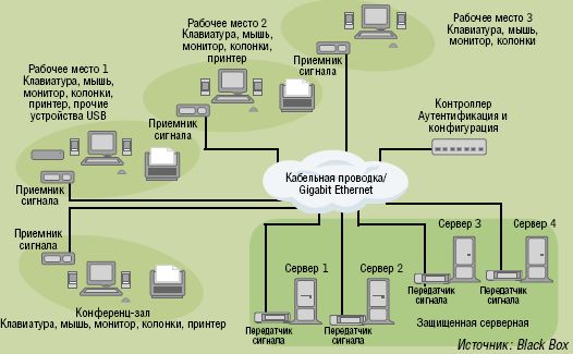 Повышение гибкости системы достигается с помощью управляющего сервера и объединения нескольких удлинителей в одну свободно масштабируемую матрицу KVM (см. Рисунок 1). Такие решения базируются на передаче по Gigabit Ethernet. Для приложений, нуждающихся в высокой пропускной способности, рекомендуется создать отдельную кабельную проводку, отвечающую за передачу потока данных KVM, с тем чтобы не использовать для этих целей локальную сеть.