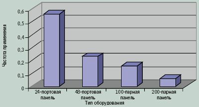 В дальнейшем мы ограничимся рассмотрением панелей, которые используются для формирования функциональной секции горизонтальной подсистемы и, соответственно, устанавливаются в кроссовой этажа или ее аналогах. Данный вид коммутационных изделий группового назначения наиболее важен в своем классе. Это обусловлено тем, что даже в СКС с развитой магистральной подсистемой на горизонтальную подсистему тратится не менее 80% всех ресурсов, требуемых для создания кабельной системы. Поскольку кабельных элементов, необходимых для реализации кабельного тракта на магистральном уровне (два волокна в групповом режиме и две витые пары против четырех витых пар в горизонтальной подсистеме), устанавливается меньше, панели горизонтальной подсистемы оказываются наиболее распространенным типом группового коммутационного оборудования. Данное утверждение полностью подтверждается статистикой реализованных проектов (см. Рисунок 2).