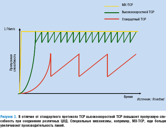 Рисунок 1. В отличие от стандартного протокола TCP высокоскоростной TCP повышает пропускную способность при соединении различных ЦОД. Специальные механизмы, например, MX-TCP, еще больше увеличивают производительность линий.