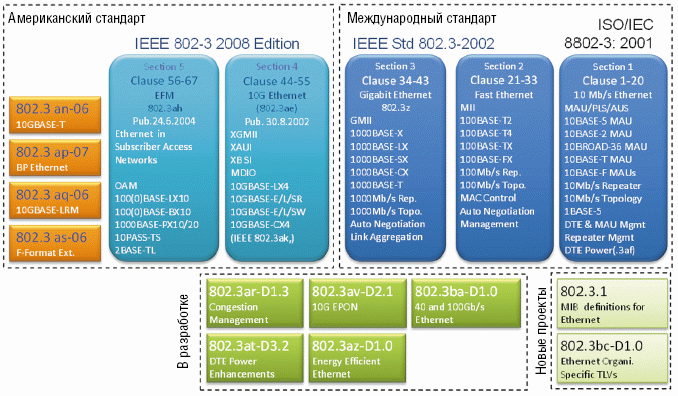 Переработка стандарта 802.3, Ethernet, завершена. Теперь опубликован целостный стандарт. На международном уровне признаны первые три раздела (на Рисунке 1 выделены темно-синим цветом). 10 Gigabit Ethernet (раздел 4) и Ethernet на первой миле (Ethernet in the First Mile, EFM, раздел 5) еще не ратифицированы ISO. Однако будучи американскими стандартами, они не становятся при этом менее обязательными для Европы. В разработке находятся несколько стандартов.