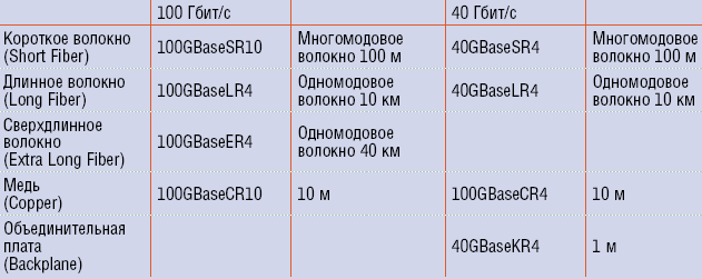Таблица 1. Обзор интерфейсов 40/100 Гбит/с стандарта 802.3ba.