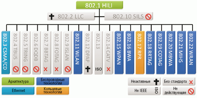 Рисунок 3. Обзор всех рабочих групп IEEE-P802 и их текущего состояния.