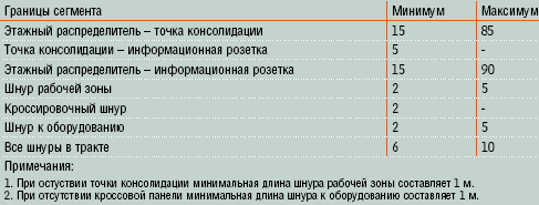 Заметим, что данные, приводимые в таблице, носят справочный характер, в то время как обязательными для соблюдения являются формулы, публикуемые в стандарте ISO/IEC 11801. Эти формулы используются для точного расчета заданных требований, в частности, в измерительных приборах (анализаторах кабельных систем). Все расчеты будут уточнены с выходом Поправки 2, принятие которой ожидается в 2009 г. Линия может быть верифицирована как тракт Класса 7A только после публикации Поправки 2 к ISO/IEC 11801:2002. Согласно Поправке 1, для достижения минимальных межкабельных переходных помех (ANEXT) допустимые длины сегментов кабельной подсистемы должны находиться в пределах, обозначенных в Таблице 2.