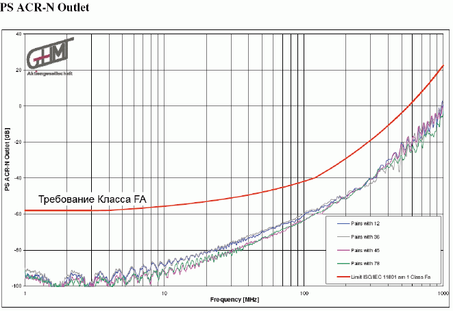 Испытания тракта AMP Netconnect, состоящего из кабеля PiMF 1200 AWG22 90 м, двух розеток ACO Plus со вставками ARJ45 на концах кабеля и двух шнуров длиной 2 м с разъемами ARJ45, показали, что он полностью удовлетворяет требованиям Класса FA. Характеристики описанного выше тракта представлены на Рисунке 4. Испытания на соответствие требованиям Класса FA выполнены в лаборатории GHMT AG (Германия).