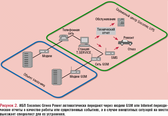 Рисунок 2. ИБП Socomec Green Power автоматически передают через модем GSM или Internet периодические отчеты о качестве работы или существенных событиях, а в случае внештатных ситуаций на место выезжает специалист для их устранения.
