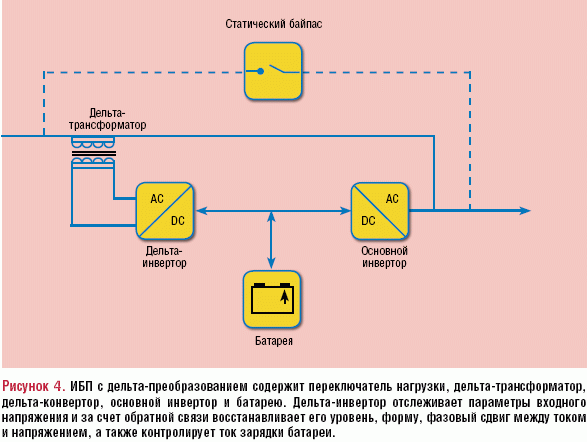 В 1998 г. APC приобрела датскую компанию Silcon Power Electronics (она выпускала трехфазные ИБП мощностью до 480 кВА), которая запатентовала принцип преобразования, обеспечивающий минимальные потери — так называемая технология «дельта-преобразования» (см. Рисунок 4). В ИБП с дельта-преобразованием используются два инвертора, выполненных по четырех-квадрантной схеме. Форма входного напряжения корректируется на дельта-трансформаторе, поэтому синусоида не уступает по качеству синусоиде, получаемой в ИБП с двойным преобразованием напряжения. Однако двойному преобразованию подвергается не вся электроэнергия, а только ее часть (до 15%), необходимая для поддержания стабильного выходного напряжения. Такие ИБП не корректируют частоту входной сети, могут работать с импульсной нелинейной нагрузкой, нормально функционируют при полном отключении или подключении нагрузки.