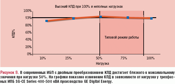 Рисунок 8. В современных ИБП с двойным преобразованием КПД достигает близкого к максимальному значения при нагрузке 50%. На графике показано изменение КПД в зависимости от нагрузки у трехфазных ИПБ SG-CE Series 400-500 кВА производства GE Digital Energy.