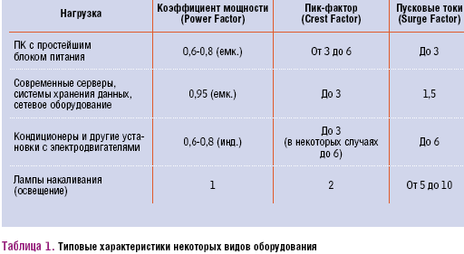 Что касается современных серверов, систем хранения данных и сетевого оборудования (коммутаторы, маршрутизаторы), то здесь дело обстоит еще лучше. В них используются блоки питания с функцией коррекции коэффициента мощности, поэтому его значение приближается к 1. Но в расчетах все же лучше считать такое оборудование нагрузкой с небольшой емкостной составляющей, а коэффициент мощности принимать равным 0,95.