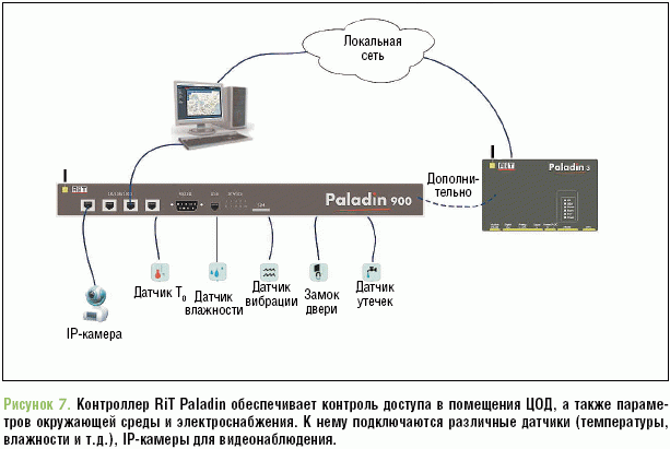 Рисунок 7. Контроллер RiT Paladin обеспечивает контроль доступа в помещения ЦОД, а также параметров окружающей среды и электроснабжения. К нему подключаются различные датчики (температуры, влажности и т.д.), IP-камеры для видеонаблюдения.